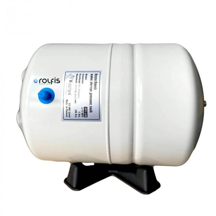 Бак Kaplya SPT 32 для фильтра обратного осмоса внутри разделен на два отсека: нижняя воздушная камера, которая отделяется от верхней специальной упругой резиновой мембраной. Такая конструкция позволяет "выдавливать" чистую воду при открытии крана давлением закаченного воздуха, без другого внешнего воздействия. Поэтому такой параметр как объем бака представляется двумя показателями: общий объем емкости - 8 литров и полезный (рабочий) - 6.0-6.5 литров для накопления чистой воды.
