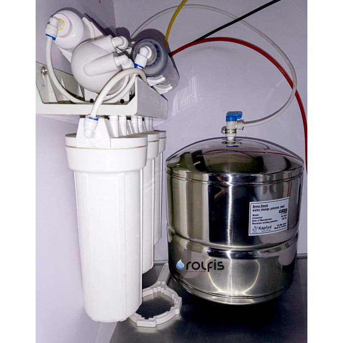 Бак Kaplya для фильтра обратного осмоса внутри разделен на два отсека: нижняя воздушная камера, которая отделяется от верхней специальной упругой резиновой мембраной. Такая конструкция позволяет "выдавливать" чистую воду при открытии крана давлением закаченного воздуха, без другого внешнего воздействия. Поэтому такой параметр как объем бака представляется двумя показателями: общий объем емкости - 15 литров и полезный (рабочий) - 11-12 литров для накопления чистой воды.