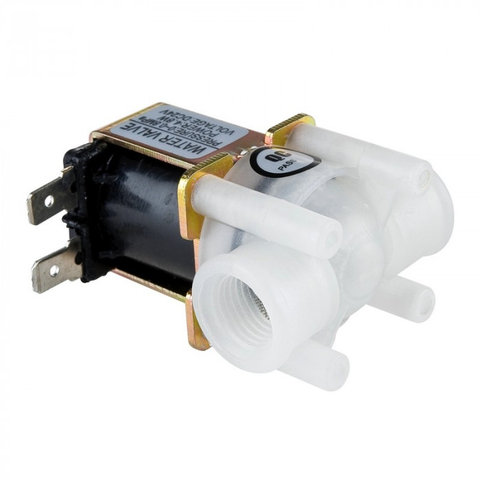 Электромагнитный клапан Atlas Filtri RE7402007 (Water Walve) применяется в системах обратного осмоса в комплектации с помпой. Устанавливается на трубку предварительно очищенной воды в любой точке фильтра перед мембраной. Питание клапана подключается параллельно питанию помпы. Пока работает помпа, клапан открыт и пропускает воду. Когда бак наполнен и датчик высокого давления останавливает работу помпы, входной соленоид перекрывает подачу воды на мембрану. В отличии от традиционного 4х-ходового клапана, такой соленоид полностью исключает слив воды в дренаж после накопления бака и остановки помпы.