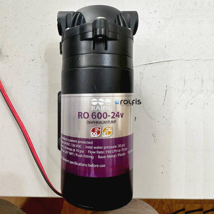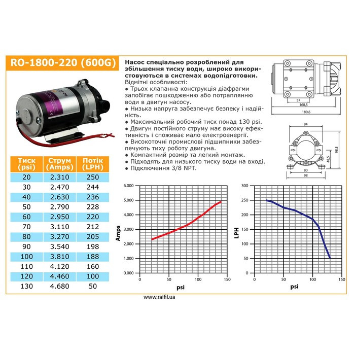 Raifil RO-1800-220 (600G) - насос (мотор) повышающий давление воды в системах обратного осмоса с производительностью до 600 галлон/сутки. Насос используется, если входящее давление воды низкое. Насос Raifil RO-1800-220 (600G) применяется в фильтрах обратного осмоса для коммерческих целей с производительностью до 600 GPD.