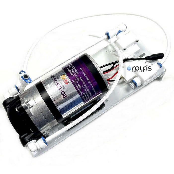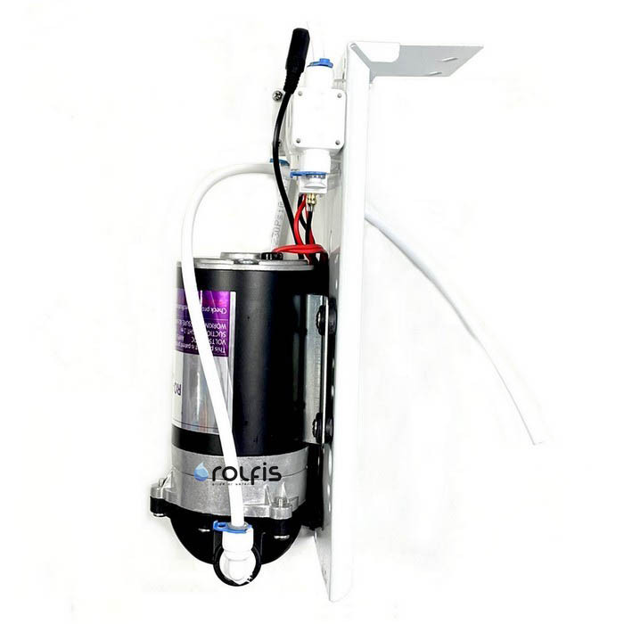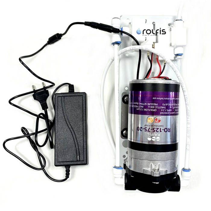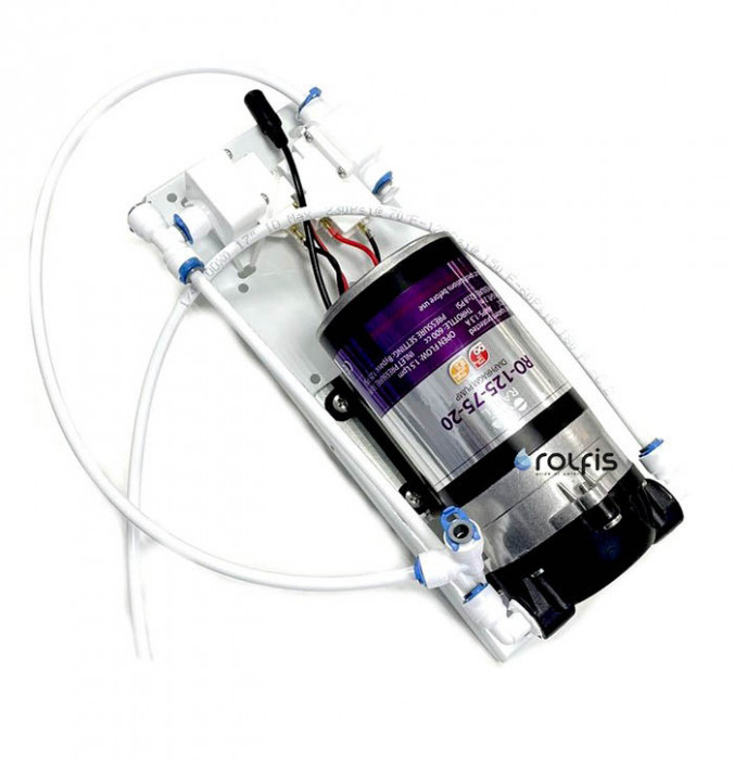 Raifil RO-125-75-20 - повышающий насос (помпа) для системы обратного осмоса на пластине, при низком давлении воды (менее 2,5 атм) в водопроводной сети. В случаях низкого давления входящей воды в систему обратного осмоса для полноценного процесса фильтрации необходимо повысить давление воды до показателя рекомендуемого производителем обратноосмотической мембраны.