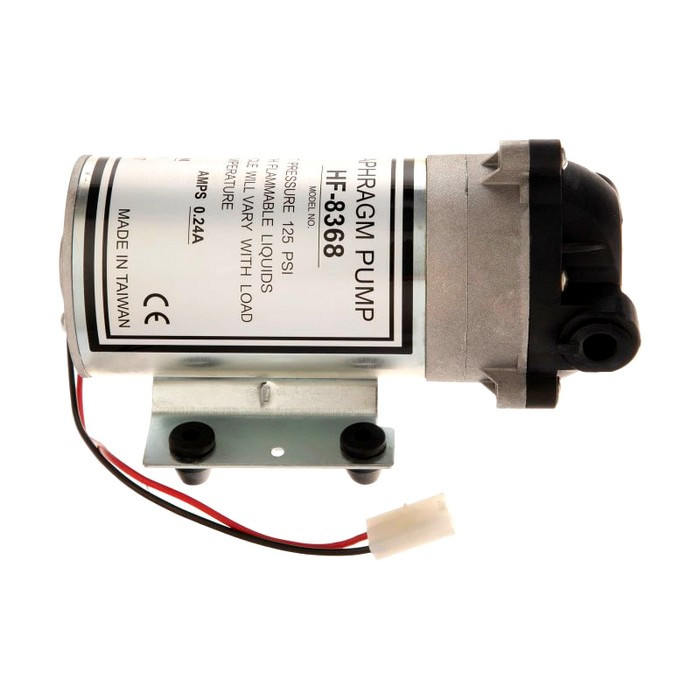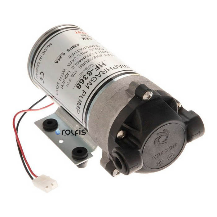 DIAPHRAGM PUMP HEADON 50G - сменный насос для систем обратного осмоса производительностью 50 GPD (около 190 л/суткти). Насос Headon 50 используется в системах обратного осмоса при недостаточном давлении в магистрали подачи воды (менее 2,8 атмосфер), входе работы насоса для осмоса показатель давление варьируется в пределах 4,2 - 6 атм.