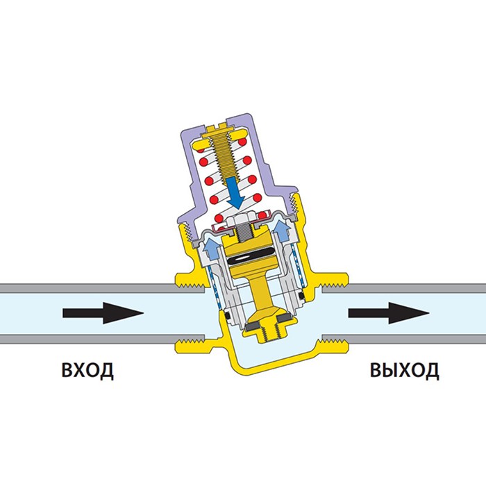 Редукционный клапан давления основывает свою работу на равновесии двух противоположных сил: толкающее усилие пружины для открывания сечения прохода и толкающее усилие мембраны для закрытия сечения прохода.