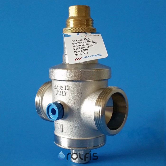Настроить необходимое давление на редукторе FARG можно с помощью ключа. Если крутить по часовой стрелке – давление увеличивается, против часовой стрелки – уменьшается. Увидеть настроенное давление можно при помощи манометра. Заводская настройка редуктор ‐ 3 бар.