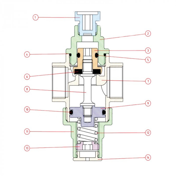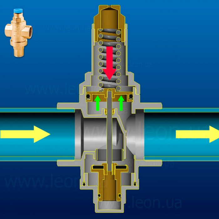 Работа редуктора FARG Minirid основана на равновесии двух противопоставленных сил, образующихся внутри корпуса. Пружина оказывает давление на сектор открытия прохода воды и вступает в силу с давлением, которое производит пружина в направлении закрытия. Настроить необходимое давление на редукторе FARG можно с помощью отвертки. Если крутить по часовой стрелке – давление увеличивается, против часовой стрелки – уменьшается. Увидеть настроенное давление можно с помощью манометра. Заводская настройка редуктор ‐ 3 бар.