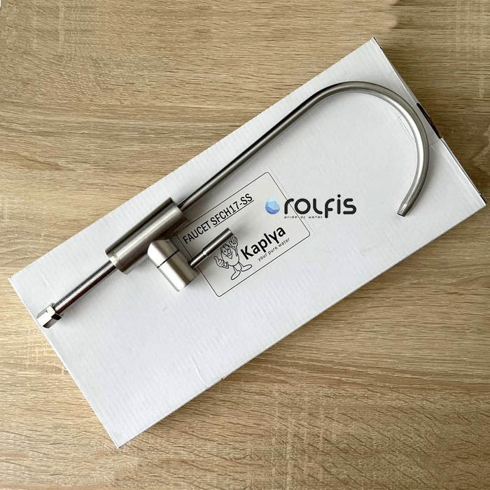 Kaplya SFCH17-SS - одинарный кран из нержавейки в стиле Модерн для питьевой воды. Подходит для любого проточного питьевого фильтра, а также для системы обратного осмоса. Кран Kaplya матовый с керамическим клапаном. Матовый питьевой кран изготовлен из нержавеющей стали SS 304. В комплект которой входят все комплектующие, необходимые для соединения крана с трубкой фильтра.