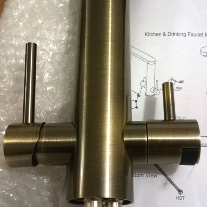 В смесителе Новая Вода NKD2212AB-L идут две отдельные ручки для регулировки горячей-холодной и очищенной воды.