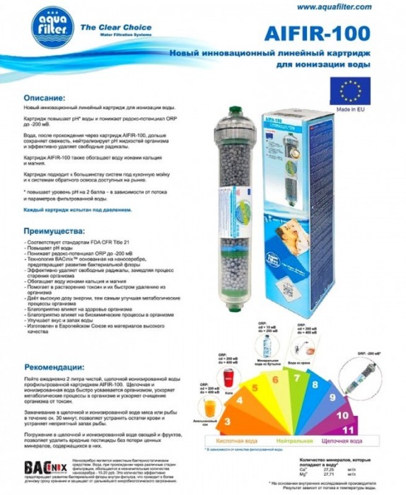 Данный линейный картридж-ионизатор Aquafilter AIFIR-100 используется для улучшения физико-химических свойств очищенной воды, а именно, снижение редокс-потенциала (снижение ОВП воды до -200мВ) и повышение показателя рН, делая воду слабощелочной, сходной по всем показателям с родниковой.