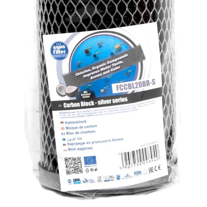 Картридж Aquafilter FCCBL20BB-S - угольный блок с функцией умягчения. Картридж серии Silver изготовлен из смеси активированных углей (50% кокосового и 50% битумного угля высокой плотности) и специального фильтрующего материала (цеолита), сертифицированных NSF.