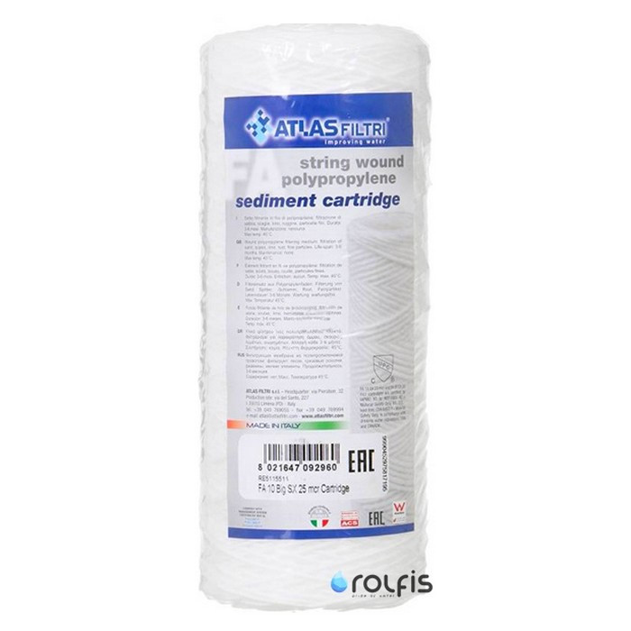 Картридж механический Atlas Filtri FA BIG 10" SX 25 mcr RE5115511 - механический картридж для холодной воды. Используется в магистральных фильтрах ВВ10. Изготовлен из полипропиленовой нити с центральным стержнем из усиленного полипропилена.