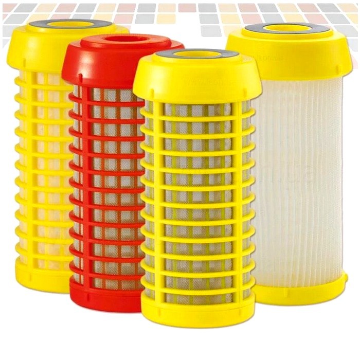 Данный картридж можно очищать не снимая его с промывного фильтра, при открытии шарового крана внизу колбы происходит падение давления и картридж опускается вниз меняя поток воды изнутри наружу, что вызывает его промывку. Так как картридж подпружинен, после промывки он возвращается в своё исходное положение.