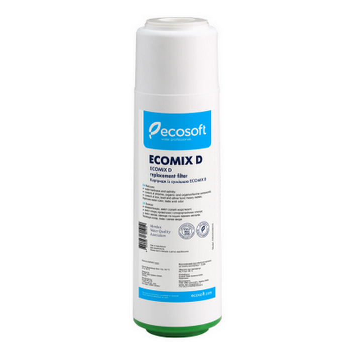 Картридж Экософт Экомикс Д для комплексной очистки имеет стандартный размер 10х2,5" и подходит под все стандартные колбы 10". Не стоит превышать рекомендуемую скорость фильтрации, это может привести к ухудшению качества очистки воды.