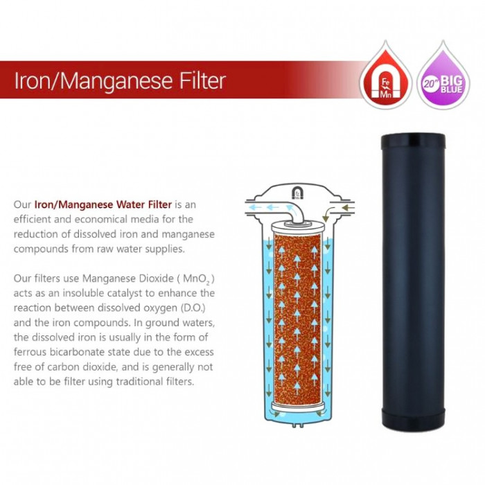 Кроме этого наличие железа в воде снижает эффективность фильтров, поэтому хорошо, когда в состав фильтра входит обезжелезивающий картридж, или же обезжелезиватель установлен отдельно. Картридж для устранения железа Fjord FRC-20BB используется для установки в колбы типа Big Blue 20 и может использоваться как отдельно, так и в комплексе с другими системами очистки воды.