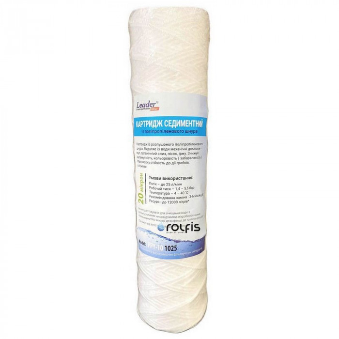 Картридж грубой очистки Leader Sediment YARN PPY-20 - универсальный картридж из полипропиленового шнура, задерживает все виды механических примесей: песок, ил, ржавчину. Картриджи из полипропиленового шнура Leader PPY-20 (20 мкм) изготовлены из чистого полипропиленового волокна, намотанного на фильтрующий сердечник. Такая конструкция обеспечивает увеличение плотности фильтра по направлению к его сердцевине. Эти картриджи предназначены для первичной фильтрации взвесей и механических отложений (песок, ил, ржавчина и др.), которые могут привести к выходу из строя отопительных приборов и бытовой техники.