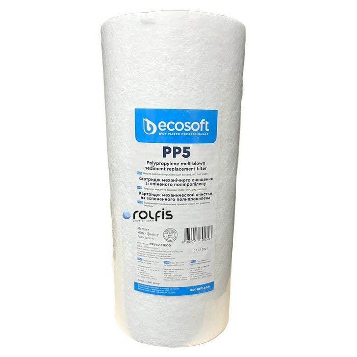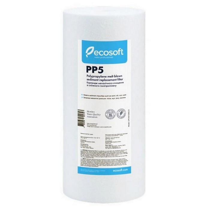 Картридж Ecosoft PP5 4,5х10" CPV45105ECO – сменный фильтрующий элемент с полипропиленового волокна для магистральных фильтров типа Big Blue 10. Предназначен для очистки холодной воды от механических примесей (ржавчина, песок, окалина, ил и т.д.) размером не менее 5 мкм.