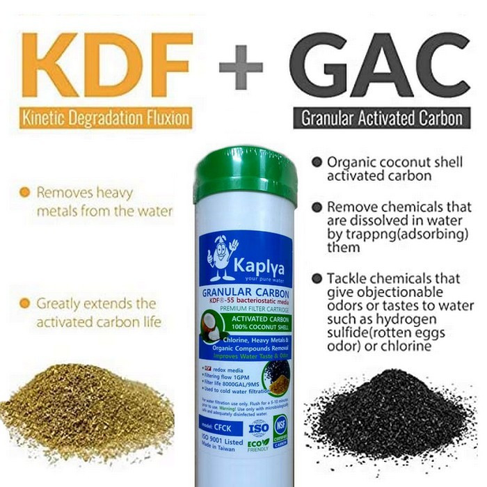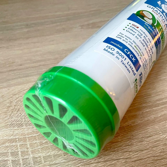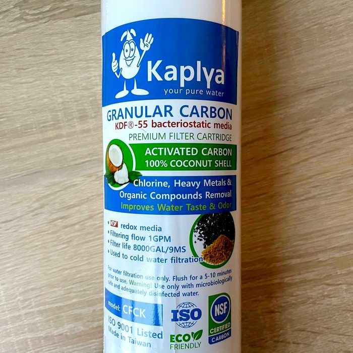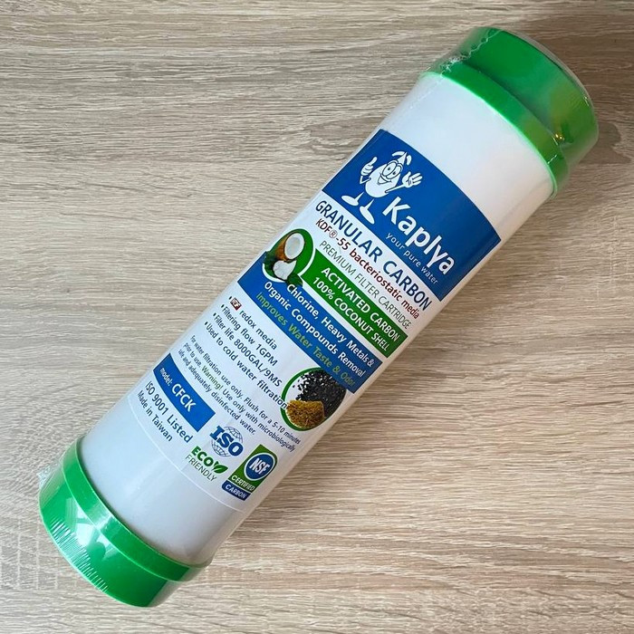 Картридж Kaplya CFCK 2.5" х 10"– сменный картридж из из 100% кокосового гранулированного активированного угля c загрузкой KDF-55. Предназначен для очистки холодной воды, а загрузка KDF-55 - применяется для глубокой химической очистки воды от хлора и ионов металлов, а также бактерицидные свойства материала. В процессе очистки воды KDF выступает катализатором идущих в фильтрующей среде химических процессов.