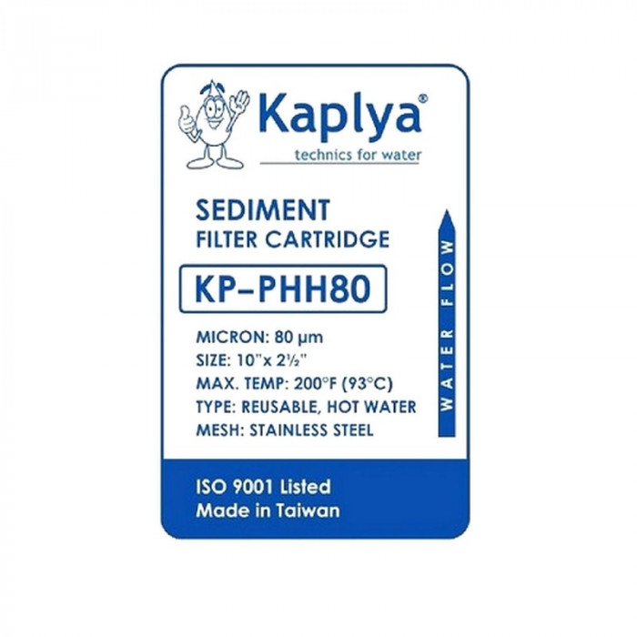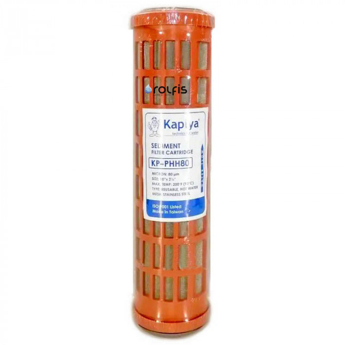 Kaplya KP-PHH80 - многоразовый промывной картридж для горячей воды, картридж состоит из нейлонового корпуса и сетки из нержавеющей стали с ячейкой 80 микрон. Картридж Kaplya KP-PHH80 используется как вставка в корпусы типоразмером Slim10" для очистки горячей воды от механических взвешенных примесей.
