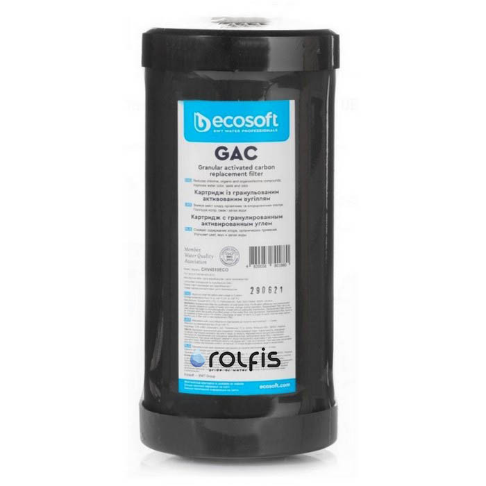 Картридж с гранулированным активированным углем Ecosoft ВВ10 имеет увеличенный ресурс по хлору до 30 000 литров. После установки нового картриджа слейте не менее 10 литров отфильтрованной воды в канализацию.