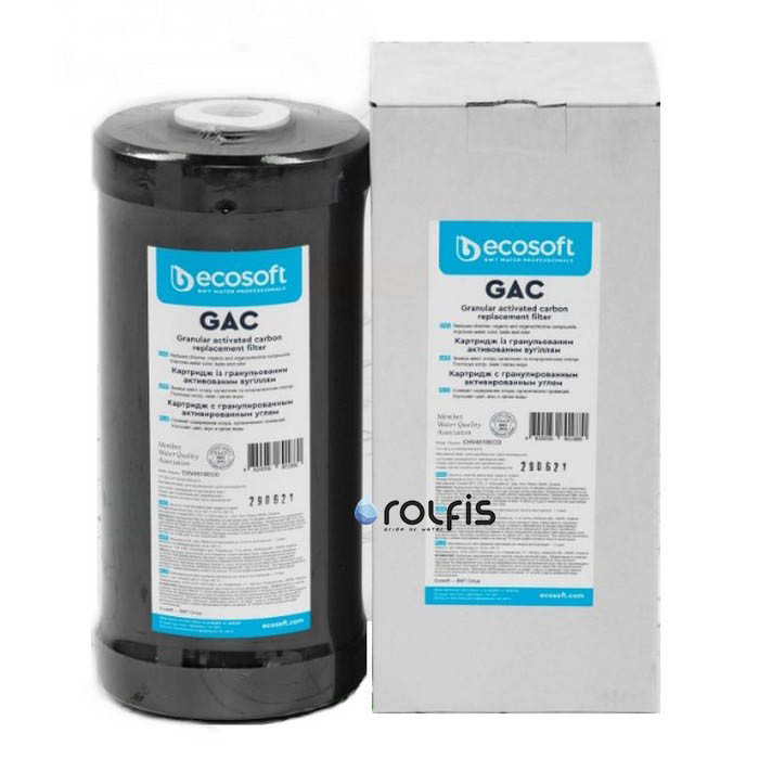 Угольный картридж Экософт имеет размер 10х4,5" и подходит под все колбы типа Big Blue 10. Не стоит превышать рекомендуемую скорость фильтрации, это может привести к ухудшению качества очистки воды.