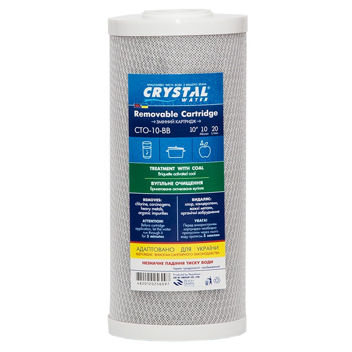 Crystal CTO BB10 – сменный картридж из прессованного активированного угля для магистральных фильтров типа Big Blue 10. Предназначен для очистки холодной воды от хлора, органических примесей, а также от механических примесей. Угольный картридж корректирует вкус и запах воды.