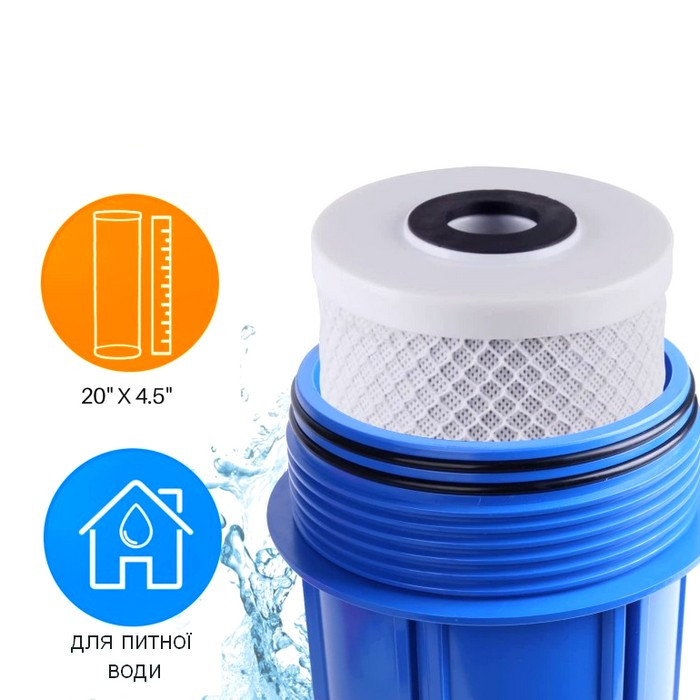 Картридж Kaplya CFBC20B - угольный картридж размера Big Blue 20 (20х4,5"). Изготовлен из 100% кокосового спеченного активированного угля. Может использвоться в любой колбе стандарта Биг Блу 20. Угольный прессованный картридж CFBC20B из спеченного активированного угля, удаляющего из воды от 98% до 99% свободного хлора, хлорсодержащие растворители, ароматические углеводороды (улучшает вкус и запах воды), а также до 85% пестицидов производных хлора. , полиароматические соединения, фенол, бензол и органические вещества.