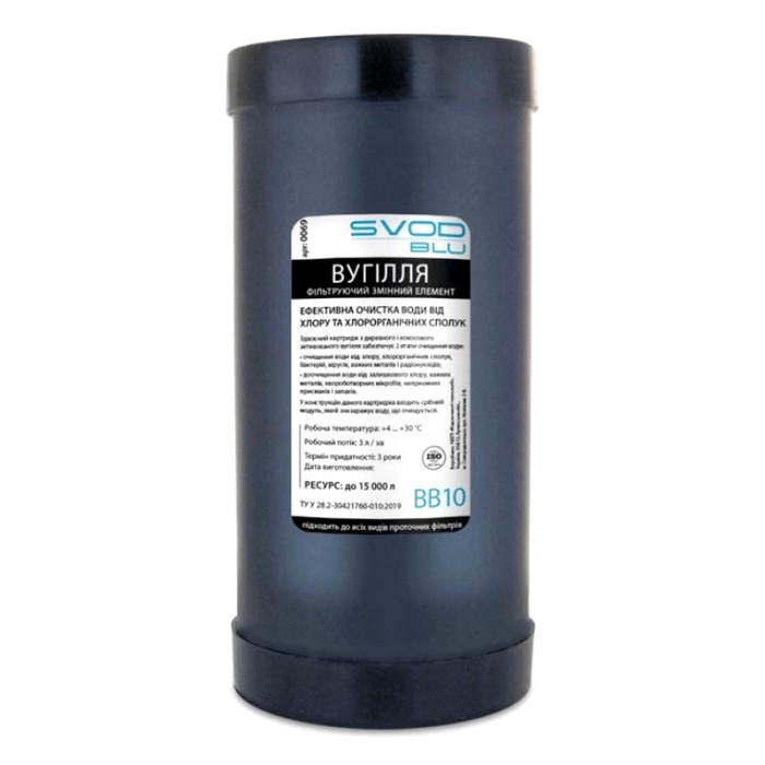 Картридж угольный СВОД "SVOD BLU" BB10 - Картридж для эффективной очистки воды от хлора и хлорорганических соединений. Картридж SVOD BLU BB10 из древесного и кокосового активированного угля, удаляет из воды хлор и хлорорганические соединения, уменьшает концентрацию тяжелых и цветных металлов, а также фенола, нефтепродуктов и пестицидов. Корректирует цвет и запах воды.