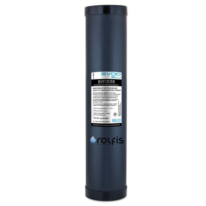 Картридж угольный СВОД "SVOD BLU" BB20 - Картридж для эффективной очистки воды от хлора и хлорорганических соединений. Картридж SVOD BLU BB20 из активированного древесного и кокосового угля, удаляет из воды хлор и хлорорганические соединения, уменьшает концентрацию тяжелых и цветных металлов, а также фенола, нефтепродуктов и пестицидов. Коррекция цвета и запаха воды.