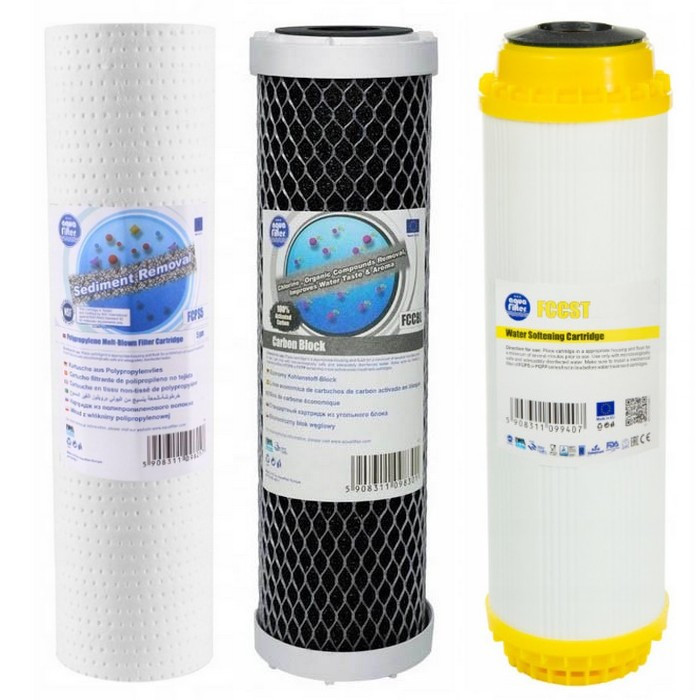 Комплект картриджей Aquafilter (механика, уголь, умягчение) для проточного питьевого фильтра. Данный комплект - польского производства и подойдет к любому стандартному проточному фильтру для воды. Такой комплект очистит воду от механических примесей, хлора, органических примесей и солей жесткости.