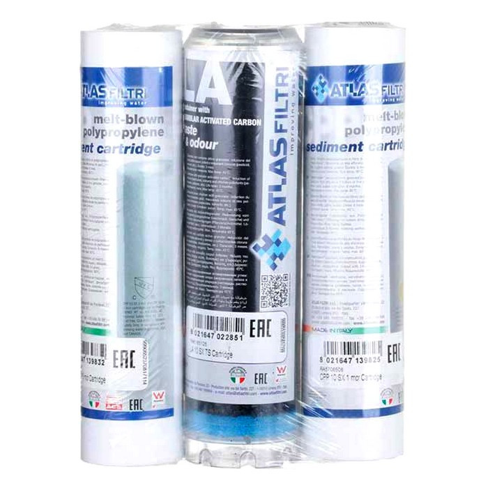 Комплект нижних картриджей (ZE5706507) для систем ATLAS FILTRI OASIS DP (CPP + LA + CPP). Данный набор картриджей подходит не только для систем обратного осмоса Atlas, а также для систем других производителей.