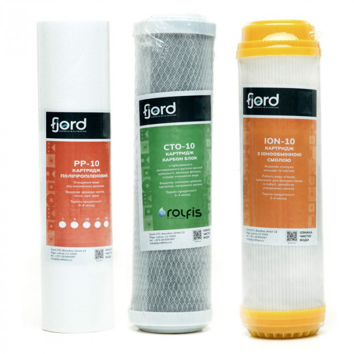 Комплект картриджей умягчающий Fjord №2 (PP-10, ION-10, CTO-10) - три сменных картриджа для очистки воды с высокой концентрацией солей жесткости (Ca/Mg). Данный комплект подходит для проточных систем фильтрации и систем обратного осмоса с типоразмером картриджей 2,5 х 10 дюймов. Основным элементом для умягчения жесткой воды служит картридж Fjord ION-10 с ионообменной смолой пищевого класса.