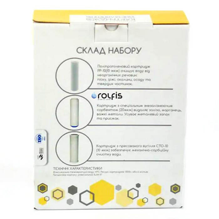Комплект сменных картриджей Pallas "Обезжелезивание" FLTKZ3 (механика, уголь, обезжелезивание) для проточного питьевого фильтра. Данный комплект подойдет к любому стандартному проточному фильтру для воды c колбами размером Slim 10. Такой комплект очистит воду от механических примесей, хлора, органических примесей и снизит концентрацию железа в воде.