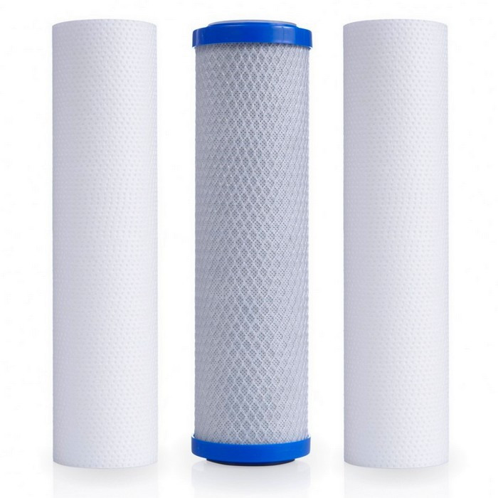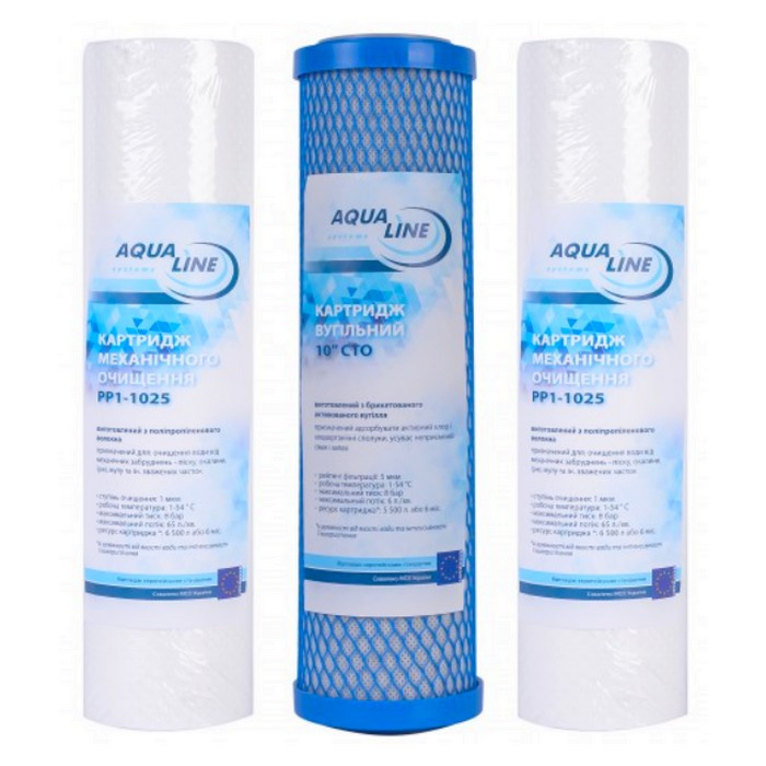 Комплект из трех картриджей Aqualine для предочистки воды в системах обратного осмоса Aqualine и Эковода, а также в других обратноосмотических фильтрах для воды.