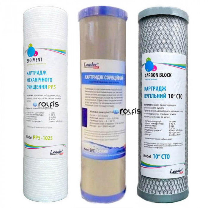 Комплект трех картриджей Leader для проточного фильтра - применяются для предварительной очистки воды в проточных фильтрах торговой марки Leader Картриджи этой торговой марки имеют специальную структуру намотки вспененного полипропилена, что позитивно отражается на их способности задерживать механические примеси всем слоем полипропилена, т.е. картриджи имеет больший ресурс в сравнении с аналогичными механическими картриджами других торговых марок.
