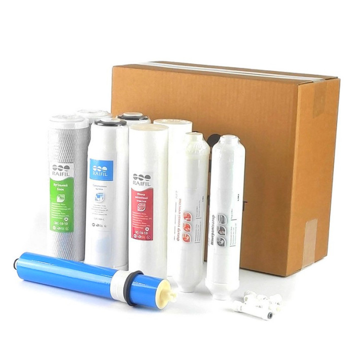 Этот комплект картриджей Raifil состоит из двух комплектов нижних картриджей, одного постфильтра с угловым фитингом и тройником, минерализатора с двумя угловыми фитингами, обратноосмотической мембраны и ограничителя потока.