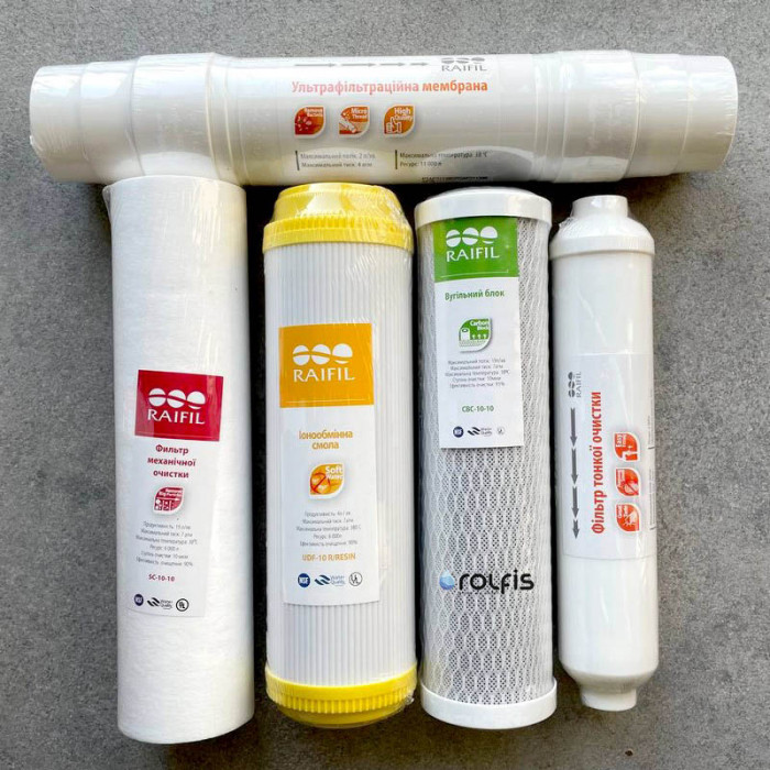 Комплект всех сменных картриджей Raifil NOVO 5 SOFT мембраны для поточного фильтра под мойку 5-ти стадийного с UF мембраной NOVO5 SOFT. Годовой комплект картриджей Raifil состоит из двух комплектов нижних картриджей, одного постфильтра с угловым фитингом и тройником и минерализатора с двумя угловыми фитингами.
