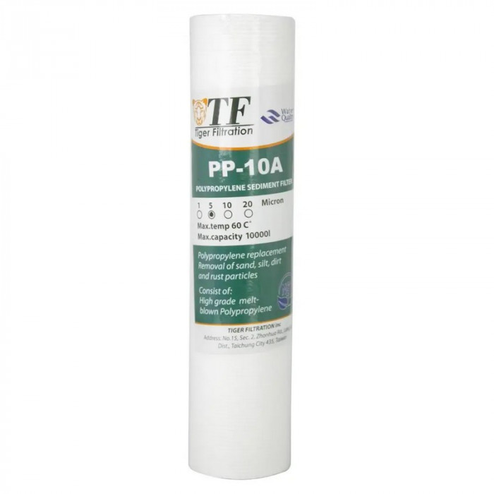 Картридж Tiger Filtration PP-10A 1 мкм - картридж для очистки воды от механических примесей из вспененного полипропилена. Тайваньский полипропиленовый картридж для магистральных фильтров или систем обратного осмоса. Основным преимуществом картриджа Tiger PP-10A является способность равномерной фильтрации воды всем своим объемом.