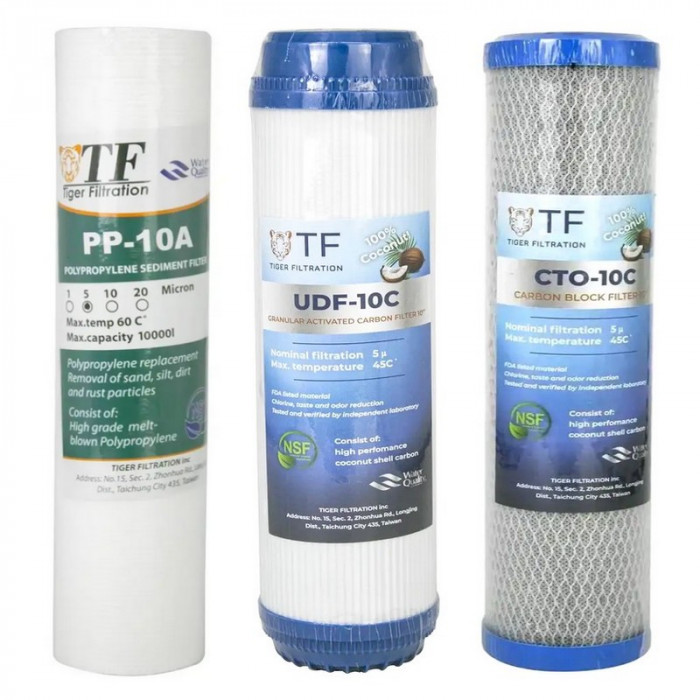Комплект картриджей Tiger Filtration 1-2-3 - в данный набор входят три картриджа, которые нужны для предварительной очистки воды перед мембранным элементом в фильтре обратного осмоса. В комплект Tiger Filtration входят два угольных картриджа (спеченный прессованный и гранулированный), поэтому он подходит для воды с высоким содержанием хлора. Картриджи Tiger Filtration подходят для фильтров обратного осмоса других производителей.