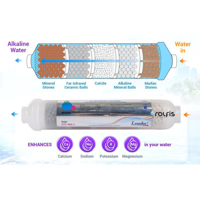 Минерализатор пятикомпонентный Leader FITF-MIN-5 - специальная версия картриджа-минерализатора для систем обратного осмоса торговой марки Leader. Минерализатор Leader FITF-MIN-5 состоит из 5 секций, наполненных фильтрующим материалом, который способствует обогащению уже очищенной воды необходимым количественным и качественным минеральным составом воды. Также корректирует уровень рН воды в диапазоне 8,2 - 9,5.