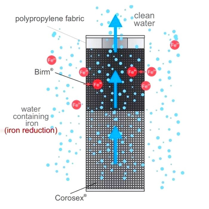 Birm® — это каталитический фильтрующий материал – природный материал, содержащие диоксид марганца для восстановления растворенных соединений железа и марганца из сырой воды. Birm действует как нерастворимый катализатор, усиливая реакцию между растворенным кислородом и соединениями железа. В артезианской воде, лишенной кислорода и не содержащей такого значительного количества органических соединений как поверхностная вода, железо обычно находится в форме раствора бикарбоната железа Fe(HCO3)2, частично гидролизованного и не фильтруется. Birm, действуя как катализатор между кислородом и растворимыми соединениями железа, усиливает реакцию окисления FeII до FeIII и производит гидроксид трехвалентного железа Fe(OH)3, который выпадает в осадок и легко фильтруется. Birm легко очищается путем обратной промывки для удаления осадка. Birm не расходуется в операции удаления железа.