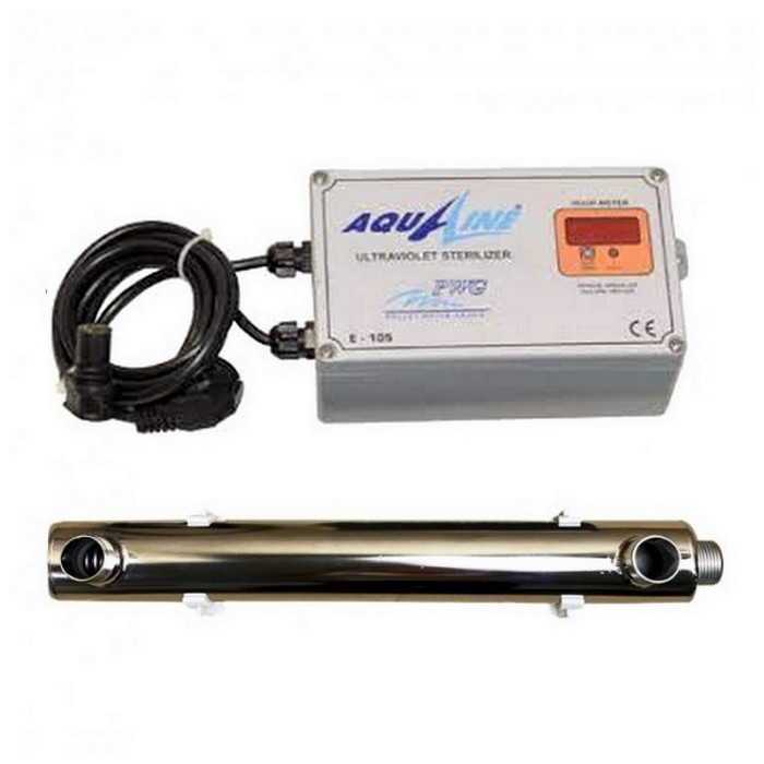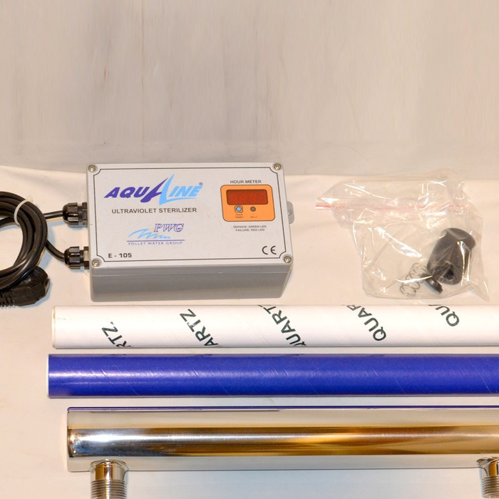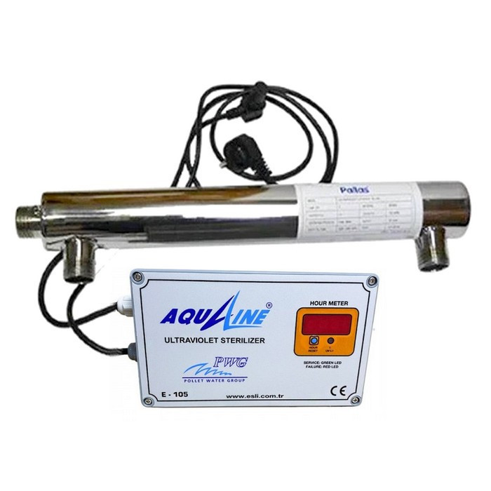 Система УФ-обеззараживания воды Pallas E-105-Plus (1,8 м3/час) - с помощью ультрафиолетовой лампы, помещенной в трубчатый кварцевый чехол, ультрафиолетовый свет, с корректировкой по дозировке, облучает проходящую через установку воду. Ультрафиолетовый свет изменяет биологические компоненты микроорганизмов, в частности разрушая химические связи в их ДНК, РНК и белках. Средний коэффициент эффективности УФ установок обеззараживания составляет 99,9 %.