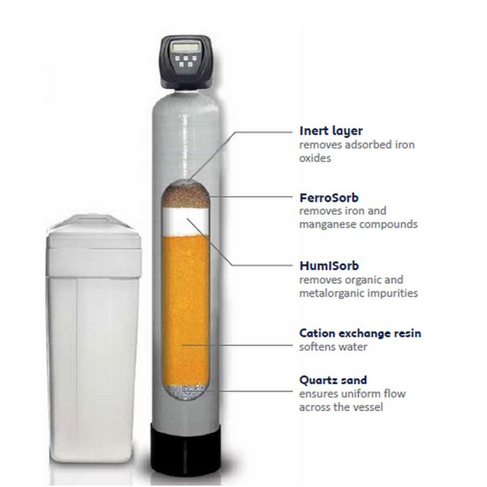 Избавит от налета на сантехнике и накипи на нагревательных элементах; уберет металлический привкус воды; снизит цветность и запах воды. Для регенерации используется обычная таблетированная соль. Раствор соли пропускается через фильтрующий материал, а удаленные загрязнения смываются в канализацию