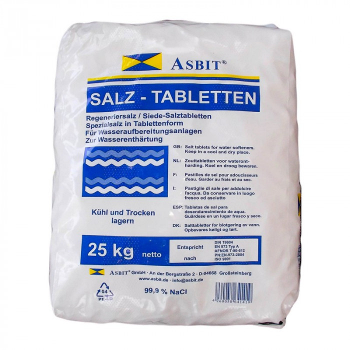 Таблетировання соль Asbit Salz 25 кг (NaCl) - Таблетированная соль предназначена для регенерации ионообменных смол, используемых в качестве фильтровального материала во всех фильтрах обезжелезивания и смягчения воды и фильтрах смягчения воды.