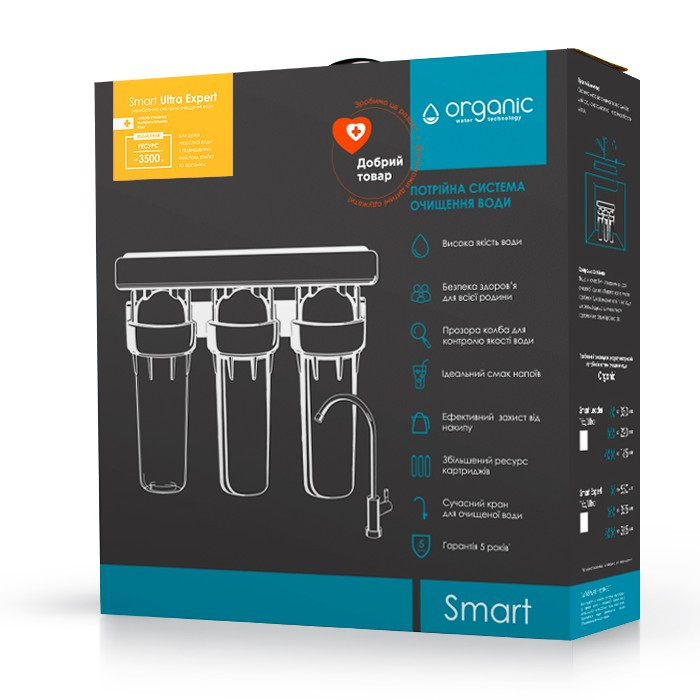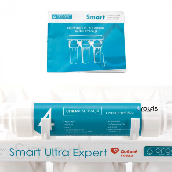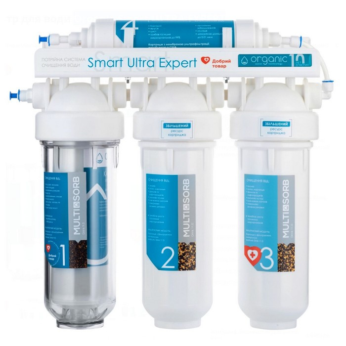 Система ультрафільтрації Organic Smart Ultra Expert має компактні розміри і встановлюється під мийкою. Для виведення питної води після фільтру на мийку або стільницю встановлюється окремий кран типу Модерн. На відміну від моделей Organic Smart Trio, дана модель оснащена ультрафільтраційною (капілярною) мембраною. Завдяки цій мембрані очищення води відбувається на глибокому рівні. Крім глибокого очищення, додатково відбувається і знезараження води.