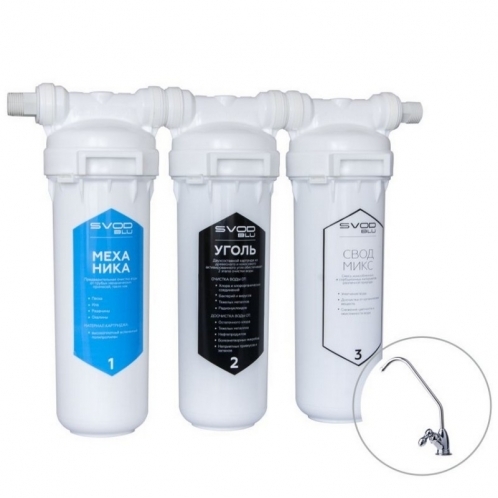 Стоит такой фильтр, правда покупал не здесь, в 3 колбе стоит уголь,а во второй микс, вода стала лучше по вкусу.Колбы прикольные, с монтажом проблем не было.Стоят уже 2 месяца, картриджи ещё не менял.
