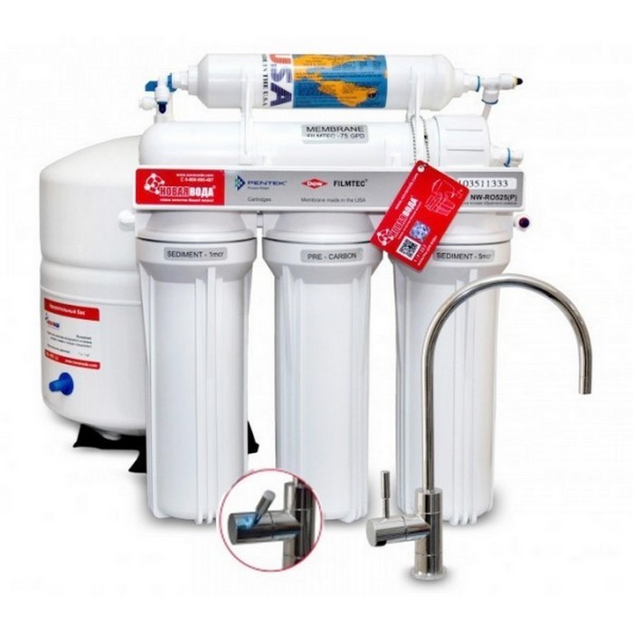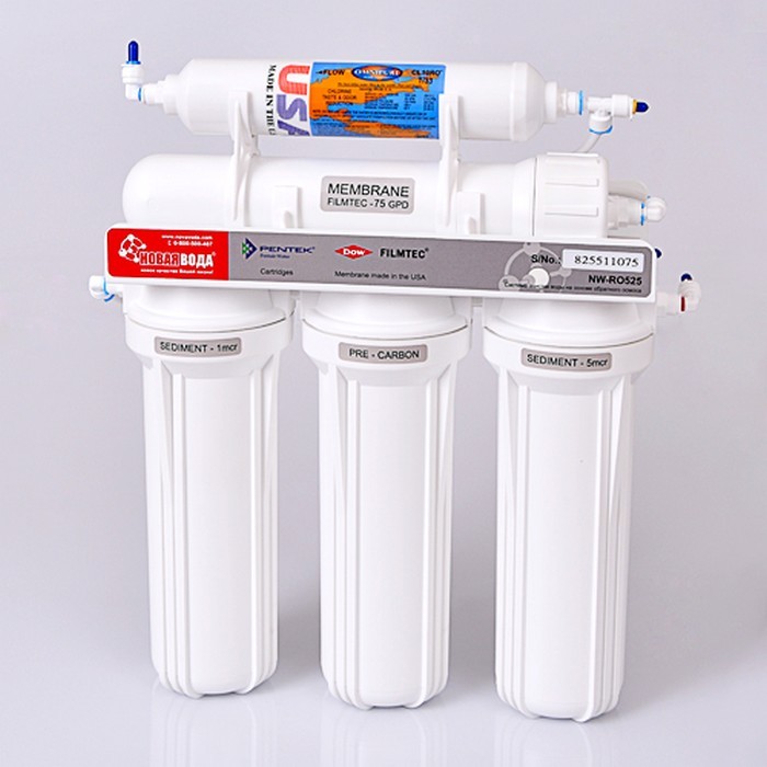 Нова Вода NW-RO525 Smart - система зворотного осмосу вітчизняного виробництва для очищення води, призначеної для питних цілей. Даний фільтр зворотного осмосу очищає воду в п'ять етапів, у тому числі і глибоким очищенням (мембрана зворотного осмосу) зі ступенем очищення до 99,5% від усіх домішок, як водопровідної, так і свердловинної води. Компактність та стандартні змінні картриджі роблять фільтр зворотного осмосу Нова Вода NW-RO525 постійним вибором українських сімей, які дбають про своє здоров'я!