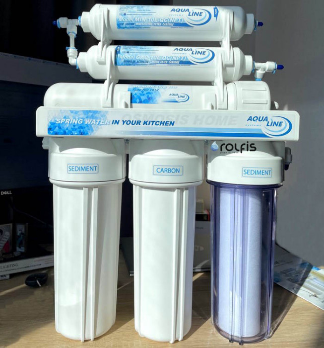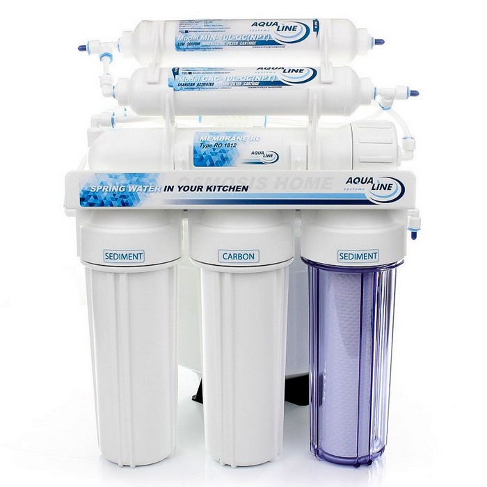 Фільтр зворотного осмосу Aqualine RO-6 - шестиступінчаста система призначена для очищення води в квартирі та приватному будинку, для споживання води відмінної якості. Воду очищену зворотним осмосом Aqualine RO-6 можна використовувати для пиття, а також приготування їжі. Продуктивність системи – до 285 л/добу. Тобто Ви можете отримувати до 12 літрів чистої питної води за годину! В даний час система зворотного осмосу - це найкращий фільтр для очищення води - ступінь очищення до 99% від усіх домішок, сприяє запобіганню утворення накипу при кип'ятінні.