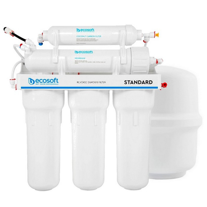 Зворотний осмос Ecosoft Standard MO 5-50 (MO550ECOSTD) - система зворотного осмосу середнього цінового сегмента, виробляється в Україні (компанія Екософт) з використанням імпортних комплектуючих. Даний п'ятиступінчатий зворотний осмос протестований тиском, а елементи, що фільтрують, підібрані для фільтрації міської водопровідної води у великих населених пунктах. Фільтр зворотного осмосу Екософт дозволить споживати чисту воду у вашому будинку в будь-який час і бути впевненим у чистоті рідини, що подається з окремого крану.
