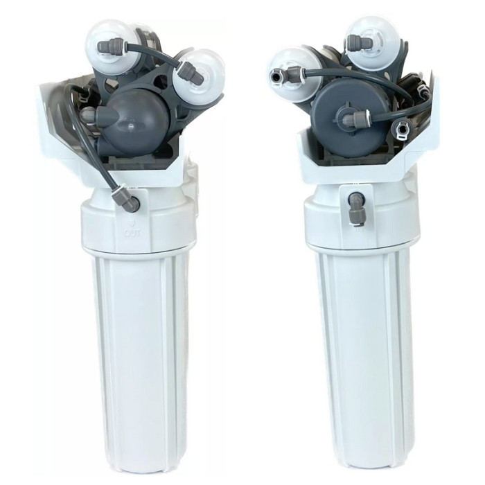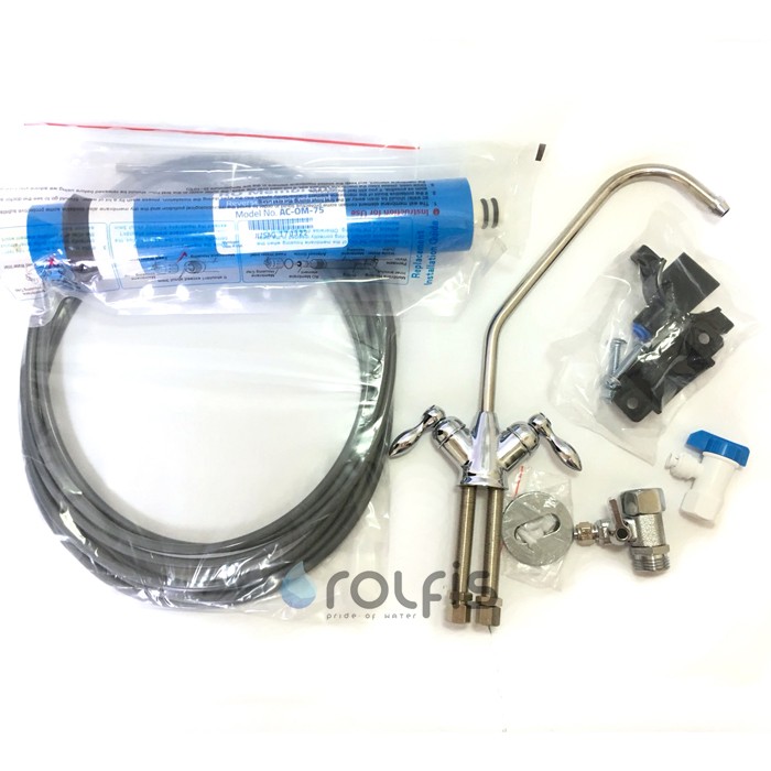 У комплектації фільтра, крім самої системи та картриджів, йде пластиковий накопичувальний бак (робочий об'єм 8 л), подвійний питний кран і повний комплект для підключення фільтра до системи водопроводу.