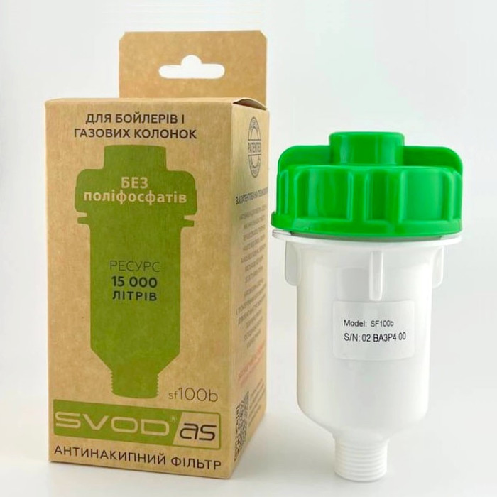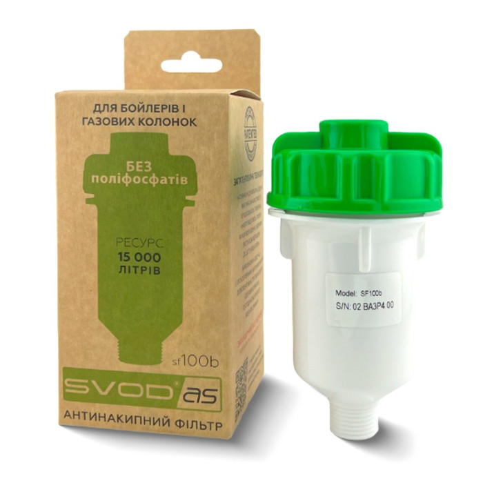 Антинакипний фільтр СВОД-АС SF100b 1/2" - фільтр від накипу, що утворюється в бойлерах і газових колонках. Рекомендований для встановлення в бойлерах не більше 50 л (проживання до 2 осіб). Здатний знизити вміст у воді важких металів і домішок, а також запобігти засміченню вузьких проток у сантехнічних та душових системах. Зберігає природні властивості води.