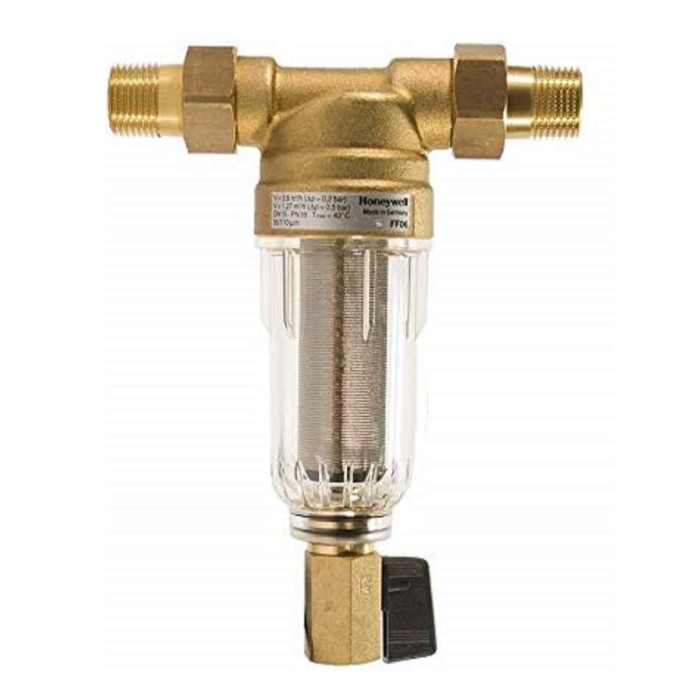 Resideo Braukmann FF06-3/4AA - фільтр для очищення холодної води від механічних домішок та забруднень. Фільтр Braukmann FF06-3/4AA здійснює безперервну подачу води. Максимальний ефект фільтрації досягається способом розташування приладу чашею вниз. Головним елементом даного механічного фільтра є сітка 100 мкм, яка ефективно затримує частинки забруднень (пісок, глину, іржу).
